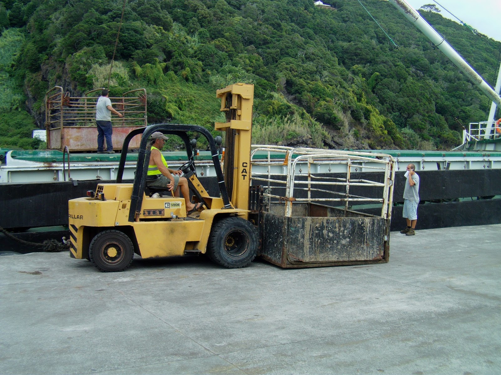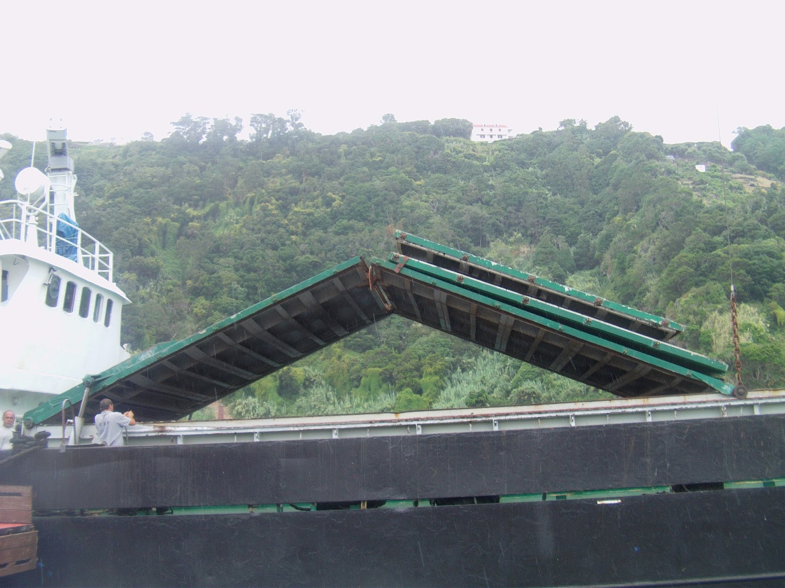 Escala desta embarcação no porto da Calheta onde se destaca a grande variedade de cargas transportadas.