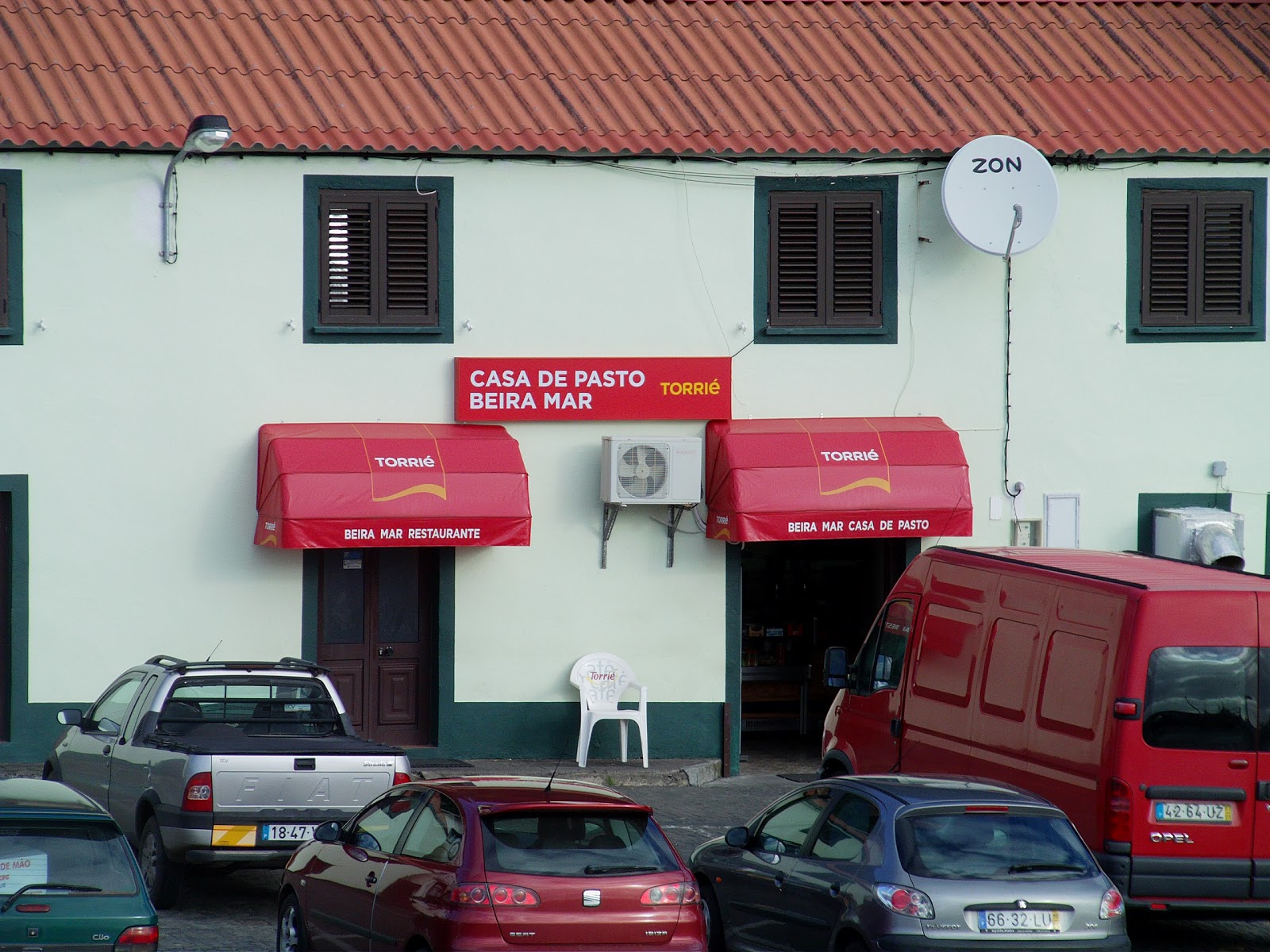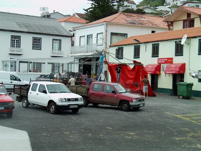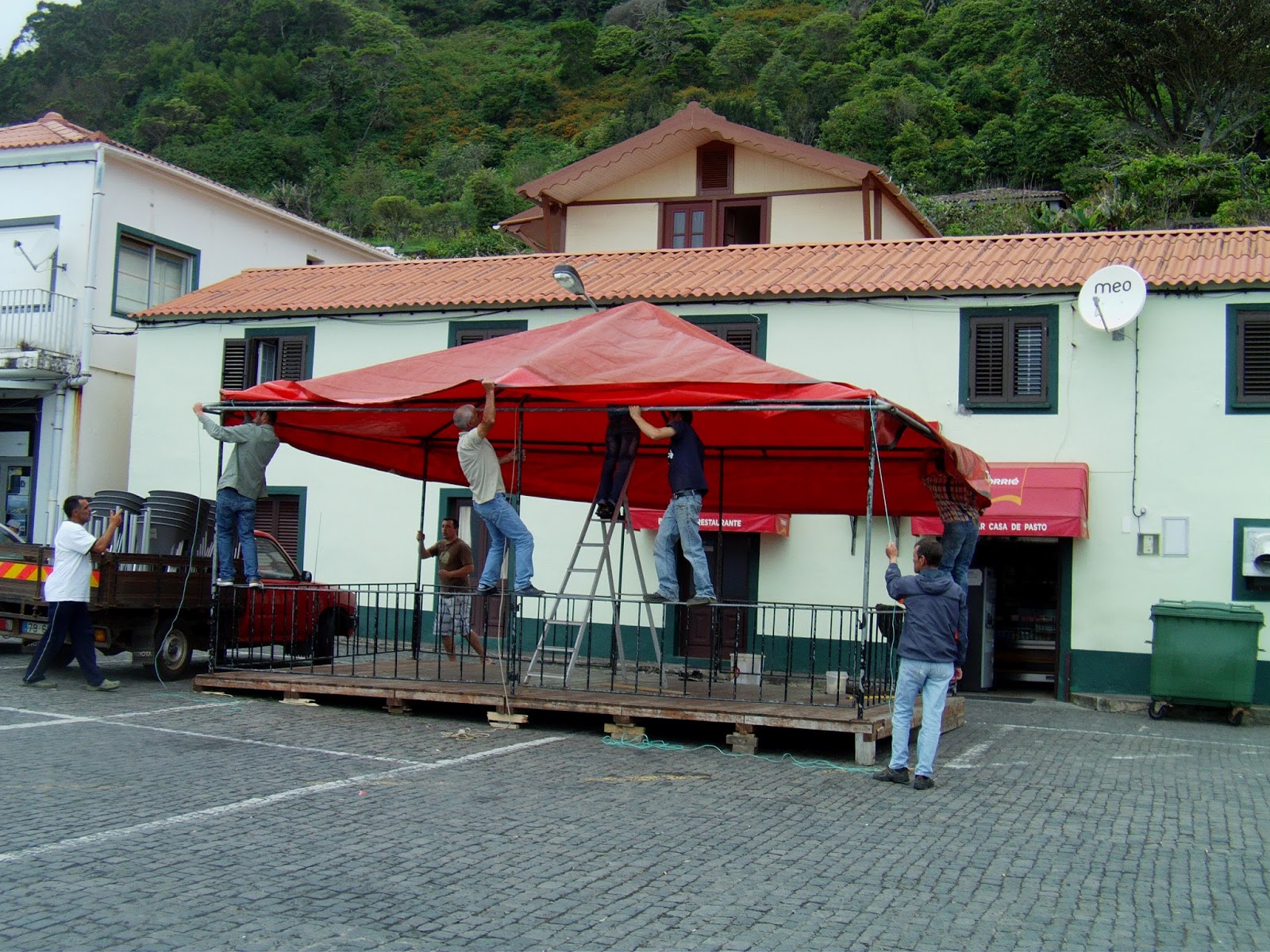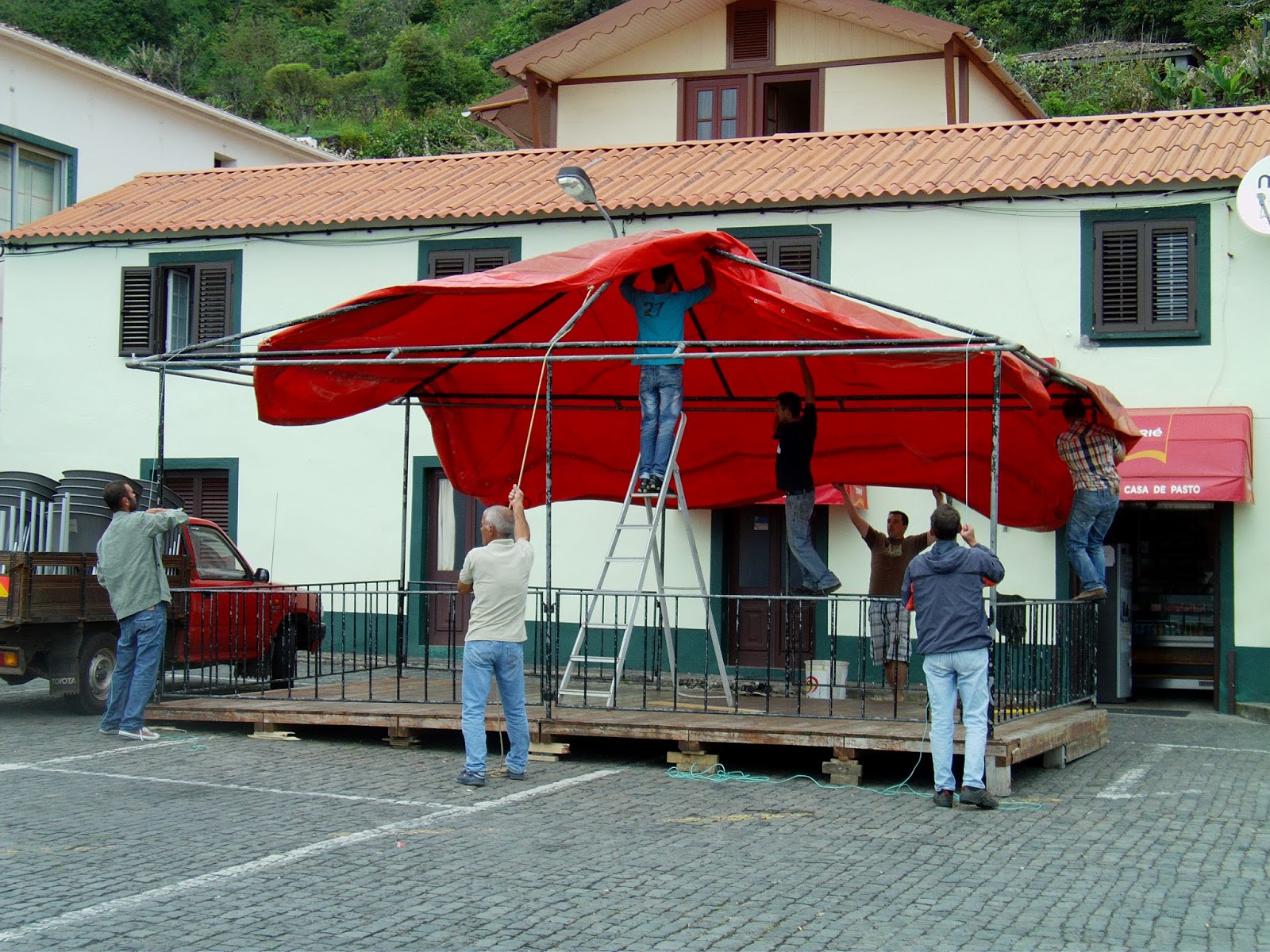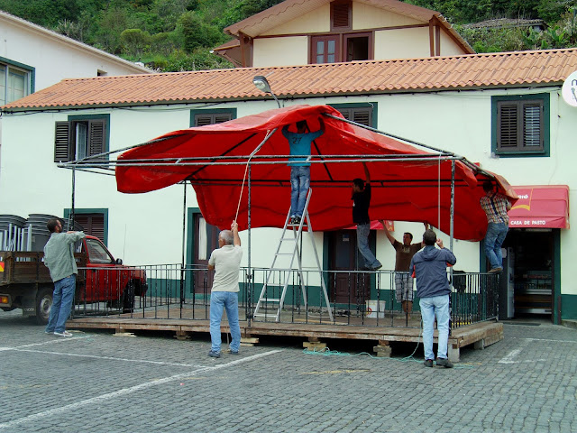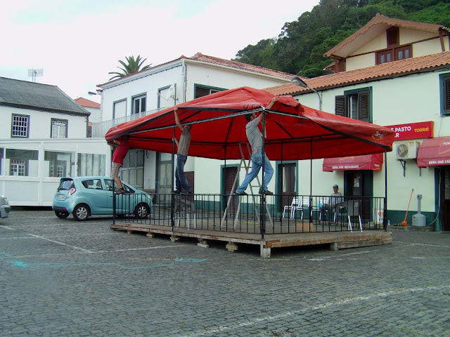 Montagem da esplanada de Verão da Casa de Pasto Beira-Mar no porto da Calheta.