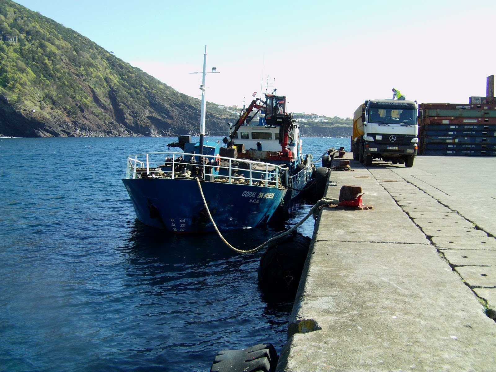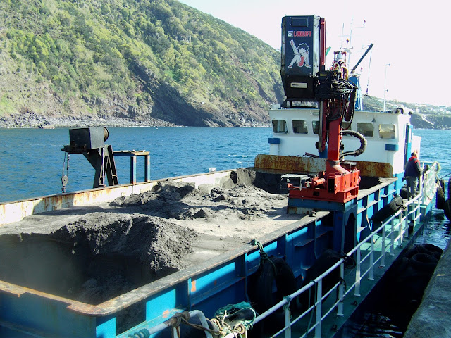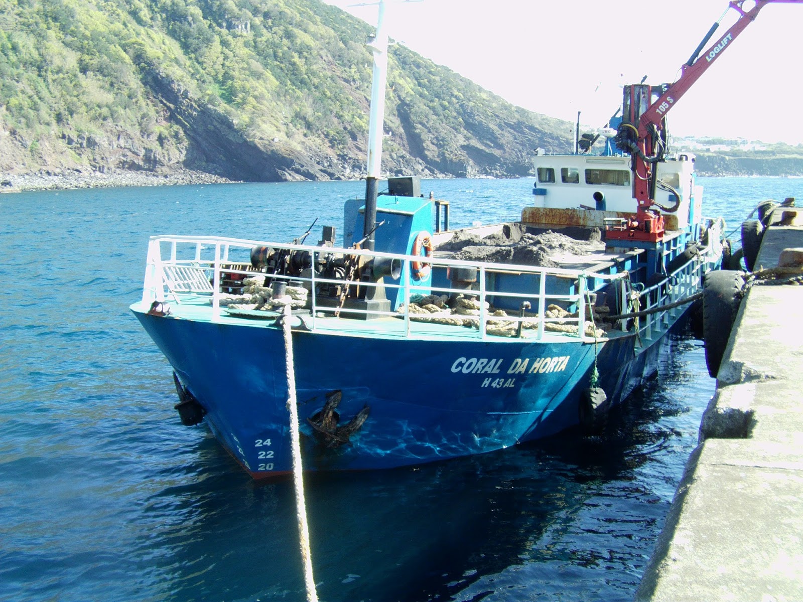 Presença no porto de Velas da draga Coral da Horta a descarregar areia para a construção civil local, bem como