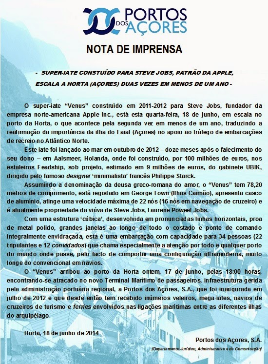 Nota de imprensa da Portos dos Açores referente à escala no porto da Horta do ultramoderno super-iate “Venus