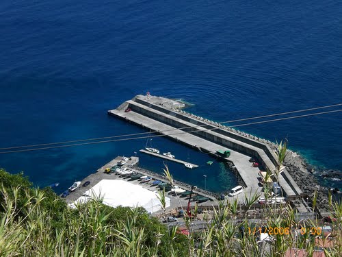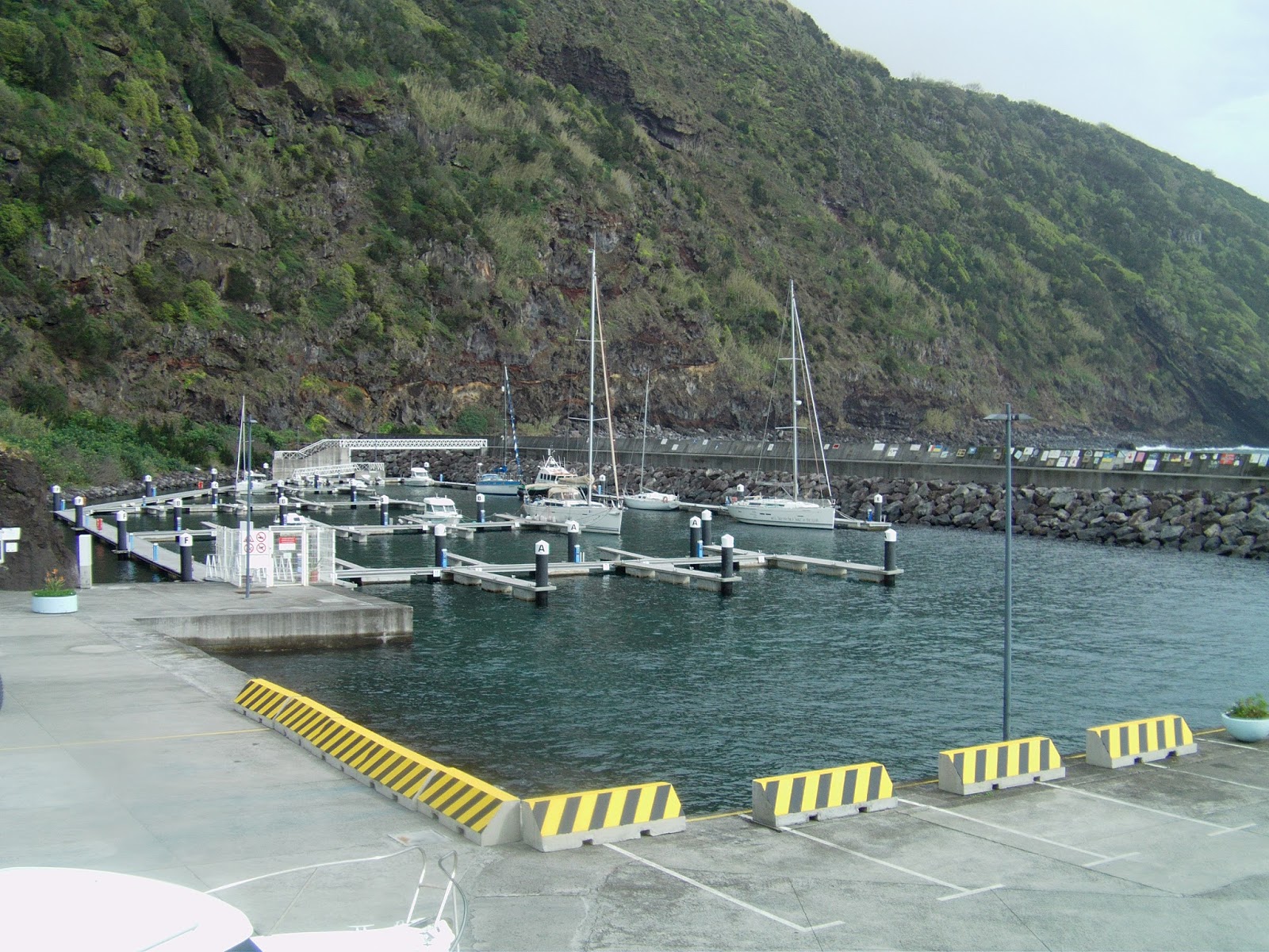 Vista geral da Marina das Velas, nesta época baixa, com poucas embarcações. De realçar as barreiras postas no parque de estacionamento adjacente à Marina para protecção de viaturas.