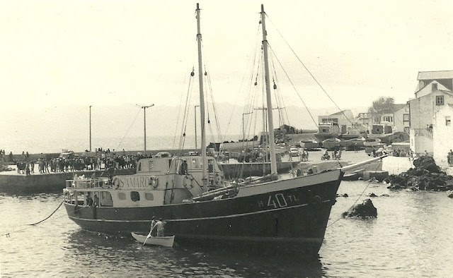 Embarcação que muitas viagens realizou no Triângulo entrando no porto da Horta com a ilha do Pico como pano de fundo.